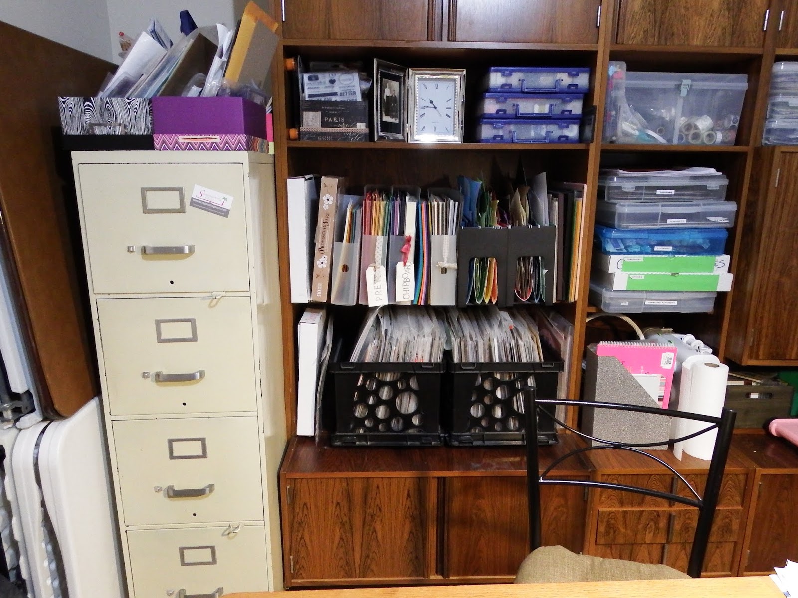 I use vertical paper holders for my cardstocks (which I personally feel I do not have enough of), hanging file folders for my scraps, and banker boxes for my page kits.